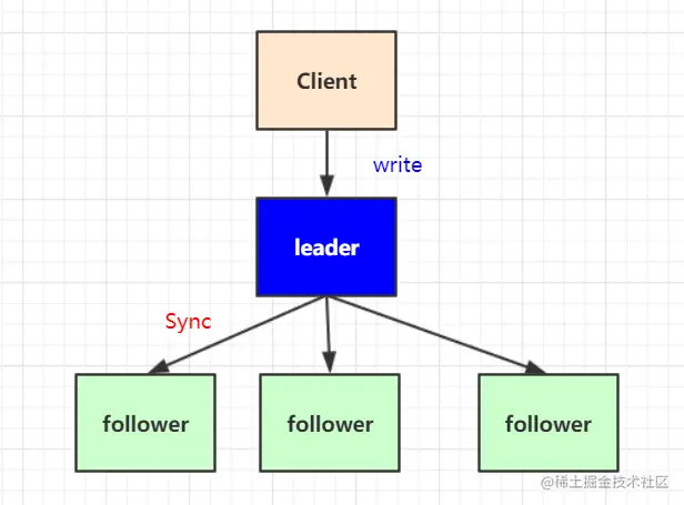 写入请求的大致流程是,收leader接收客户端写请求,并同步给各个子节点。如下图: