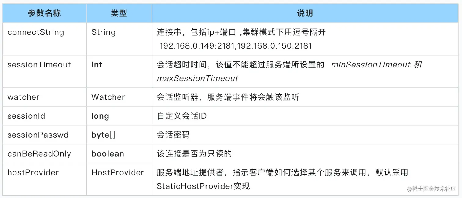 常规的客户端类是 org.apache.zookeeper.ZooKeeper,实例化该类之后将会自动与集群建立连接。构造参数说明如下: