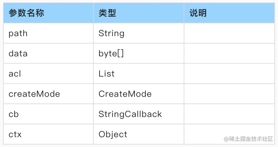 通过org.apache.zookeeper.ZooKeeper#create()即可创建节点,其参数说明如下: