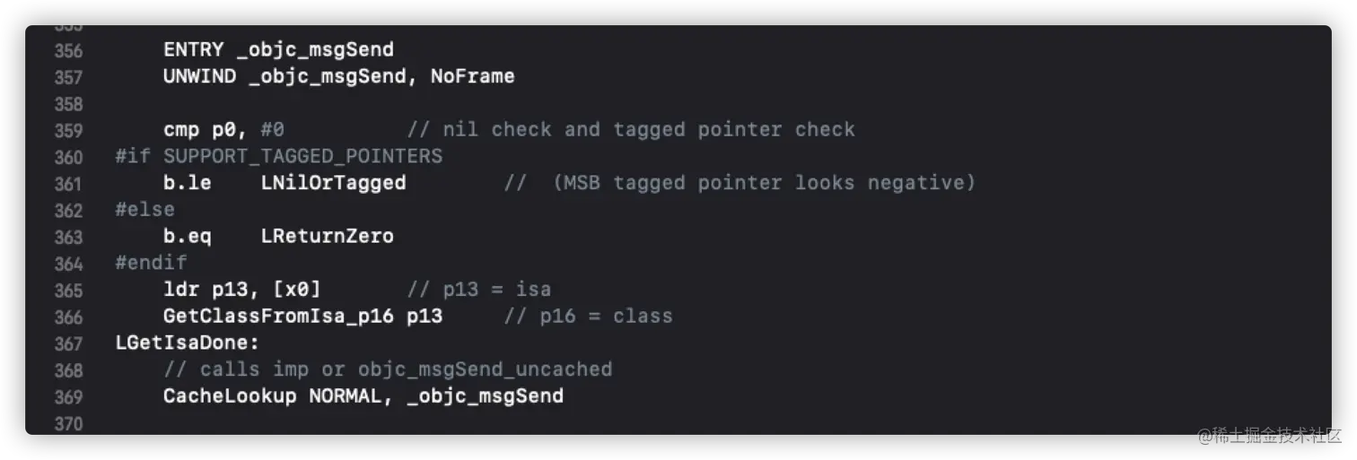 第一段代码cmp(compared对比),我们从注释就可以看到nil check判断是否为nil。其中p0是objc_msgSend的第一个参数消息接收者receiver,那么这句代码的含义就是:判断接收者是否存在。