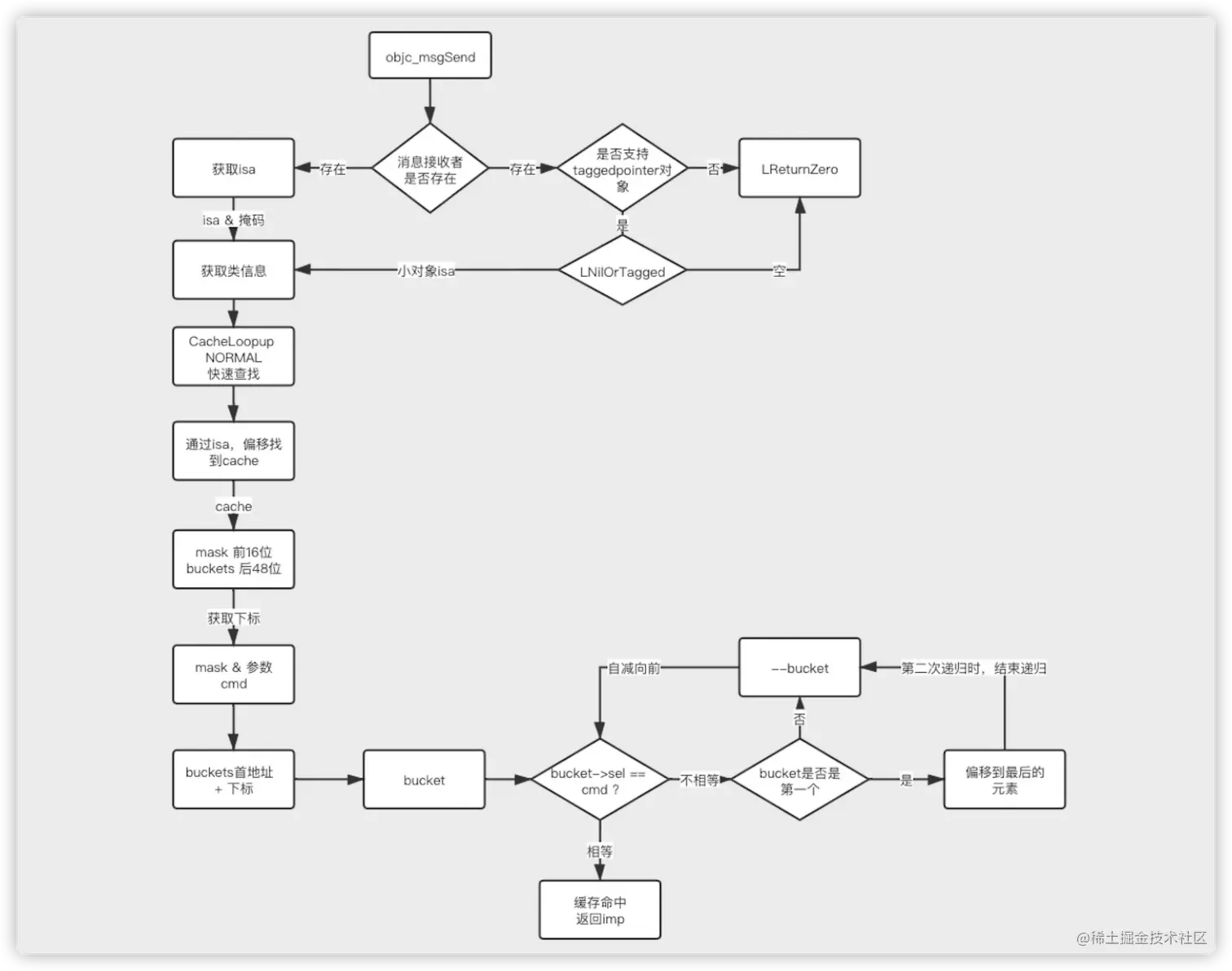 $0(传入的p13->isa)和ISA_MASK掩码进行与运算,可以得到class类信息,查找到类信息后,就可以偏移到cache进行方法的查找,即CacheLookup NORMAL 快速查找。