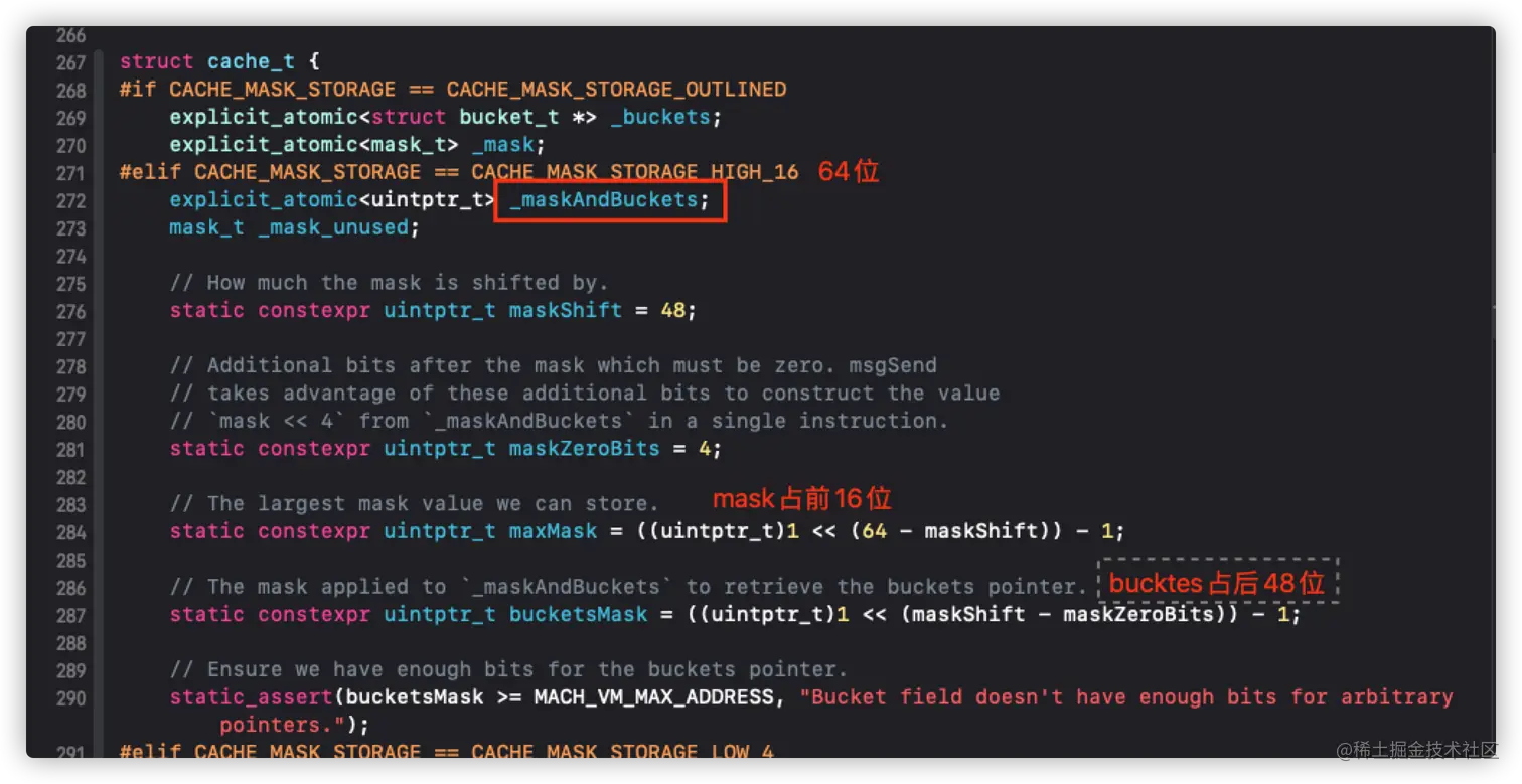 p11=cache。但是注释为什么是p11 = mask|buckets? 原因在于:在64位系统下为了节省内存读取方便,mask和buckets存在了一起,cache的结构: