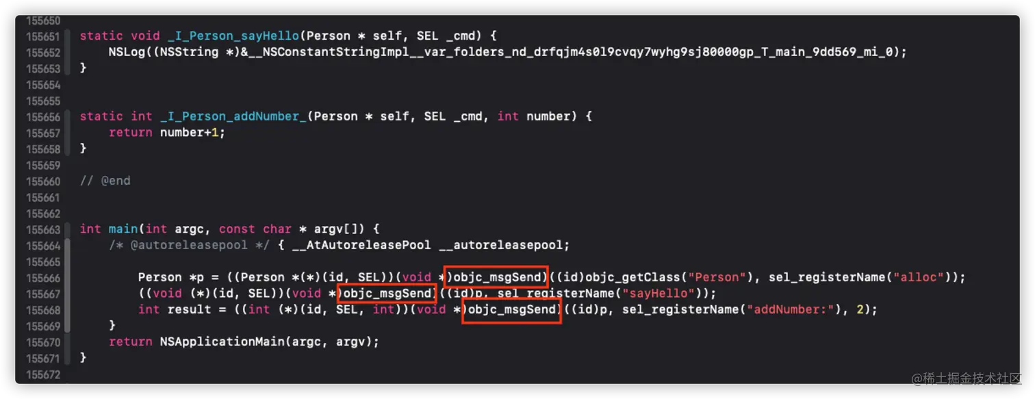 类方法alloc,还是实例方法sayHello,都会编译成objc_msgSend(消息接收者,方法主体,方法参数..)。