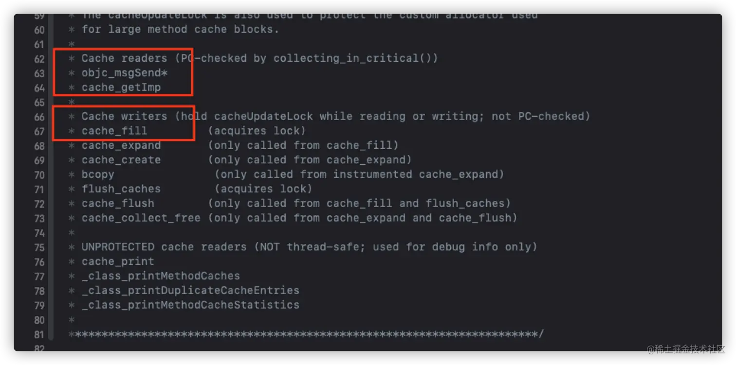Cache writers缓存写入中,会进行cache_fill操作,而且在缓存写入前,会先进行Cache readers缓存读取的过程,其中有objc_msgSend 和 cache_getImp。