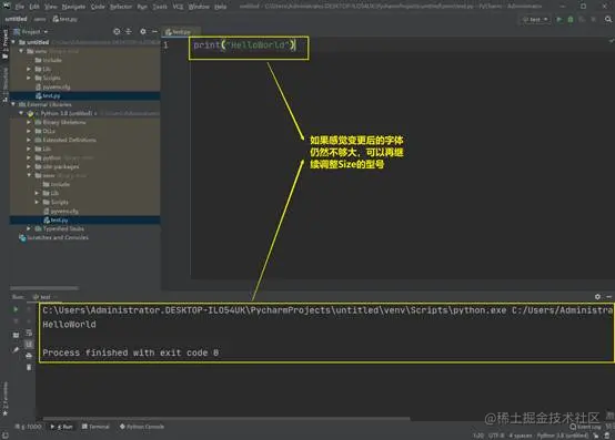 在HelloWorld练习完毕之后,一个基本的Python代码已经编写完成。不过在操作过程中我们还是感觉到使用的有些不便利,操作起来字体为何这么小?那么接下来再教给大家如何设置PyCharm的字体大小。