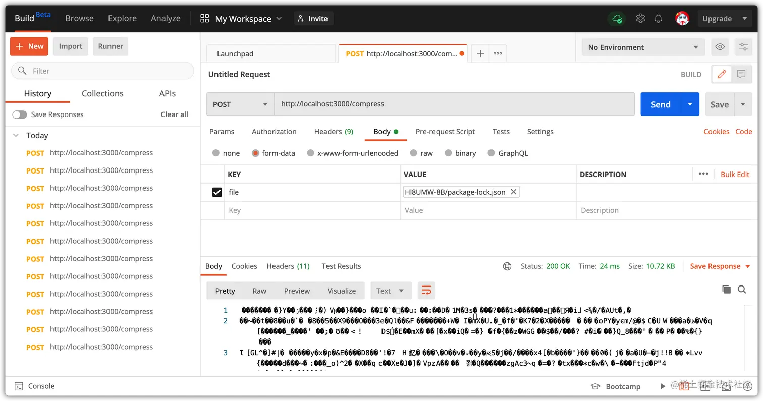 现在,我们可以在开始前端之前在Postman上测试我们的应用程序,我将压缩 package.lock.json 文件,它的大小是48kb。