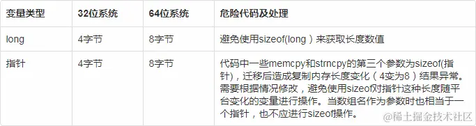 如果两个平台一个是32位版本另一个是64位版本,有些变量的长度会发生变化。需要注意的地方如下表格: