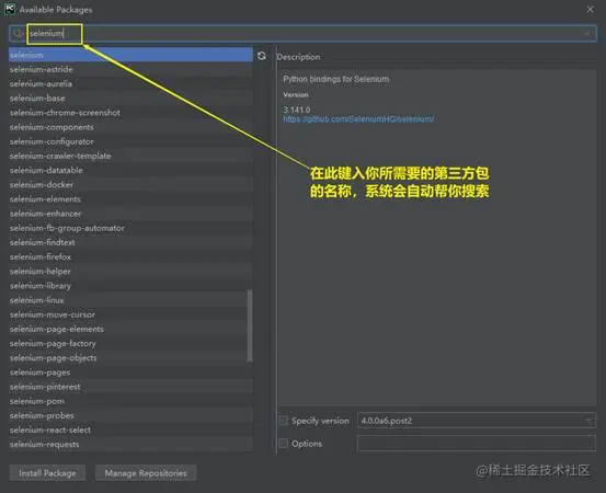 第四步,点击加号,在弹出框的左上角的框里面输入一个你需要安装的第三方包的名称(小编会以selenium为例进行说明),具体可见截图: