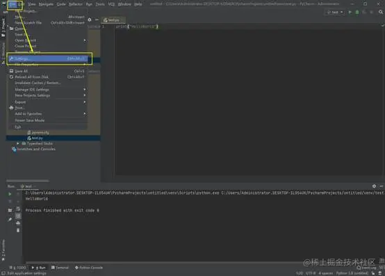 第一步,点击PyCharm左上角的File按钮,在弹出框中点击Settings,如图所示: