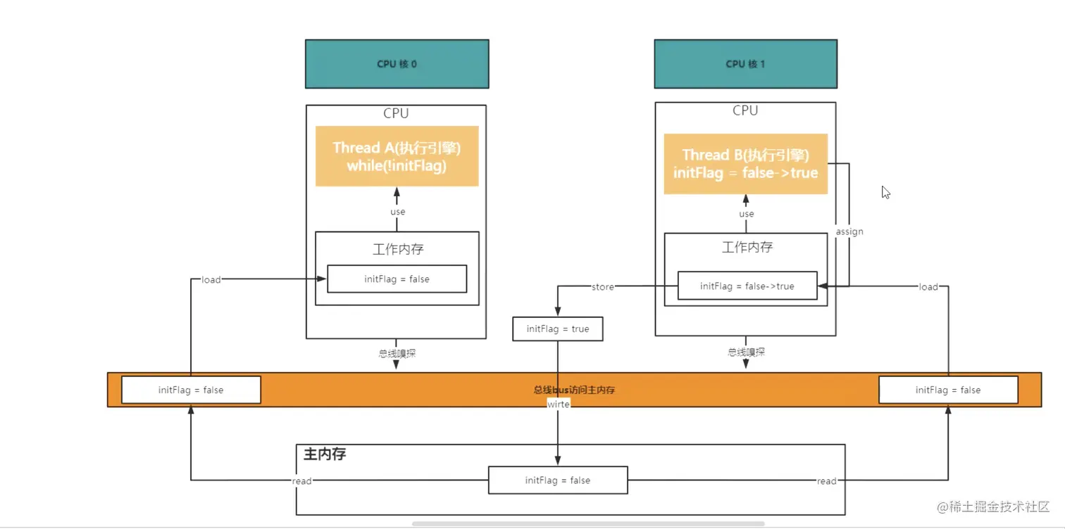 A线程读取了成员变量boolean initFlag =false,B线程改了成员变量boolean initFlag =false, 如果不加initFlag不加volatile修饰,A线程再次读取到的值的依旧是boolean initFlag =false,反之加了volatile读取到的就是boolean initFlag =false