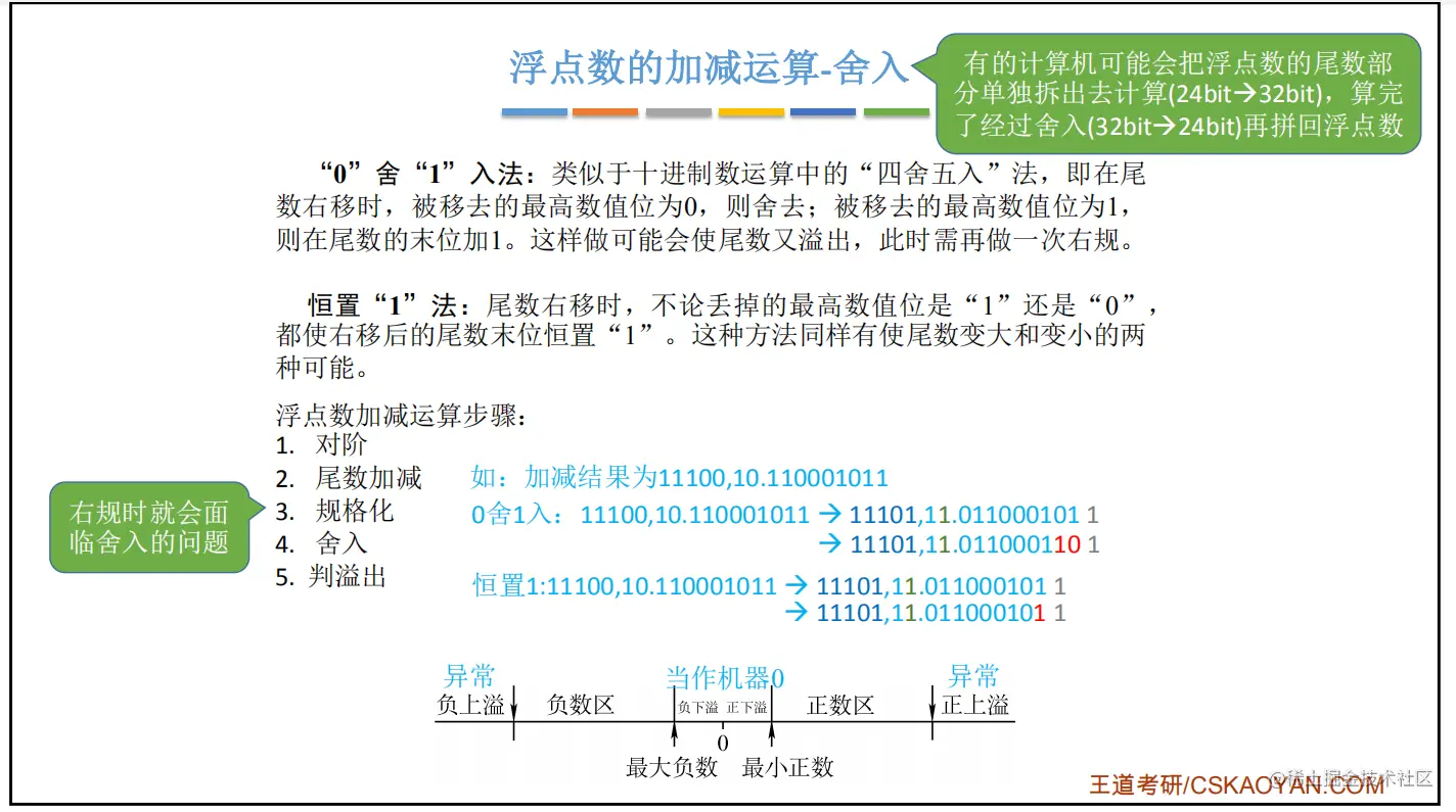 计算机组成原理笔记——浮点数运算 _hero 2020-10-06 591 阅读1分钟 1.计算 需要右规的情况:当尾数求和结果溢出(如尾数为10.xxx或者01.xxx)时,需右规,即尾数右移一位,和的阶码加1 需要左规的情况:当尾数出现00.0xxxx或者11.1xxxx时,需要左规,即尾数左移一位,和的阶码减1 如果需要右规,右规最多进行一次,左规可以进行多次 2.舍入