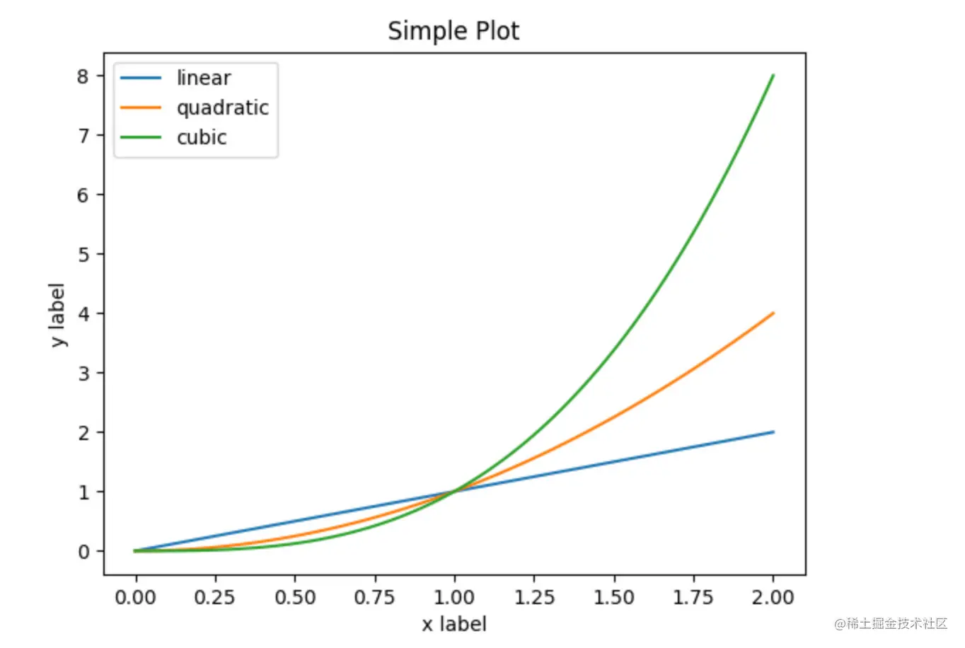 我们关注一下图像的左上角,已经替我们标好了。蓝色的是线性图像,也就是x,黄色的是x的平方,绿色的是x的立方。