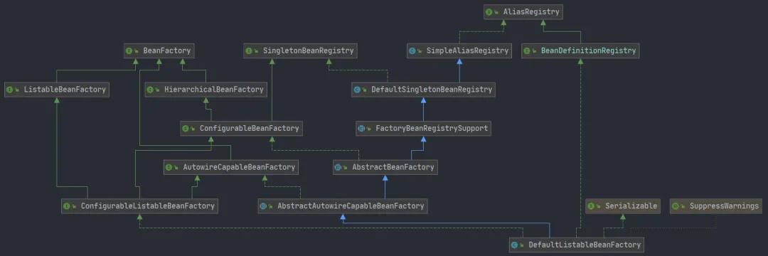 在解析之前,先将容器和BeanFactory的UML类图放出。原因在于它们担任的角色、具备的功能太多太强大了,同时这也增加了源码理解的难度。因此这里先放出UML类图作为手册查看,便于理解源码。