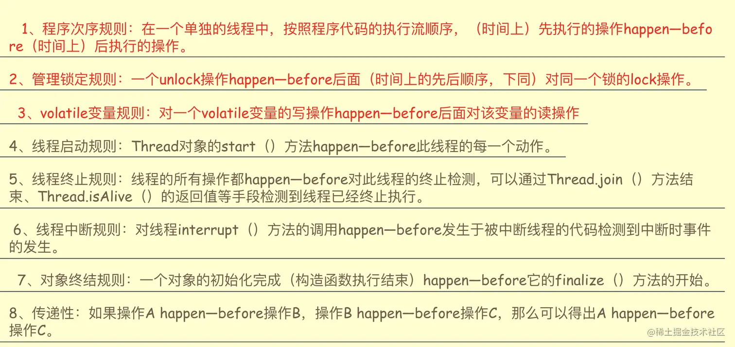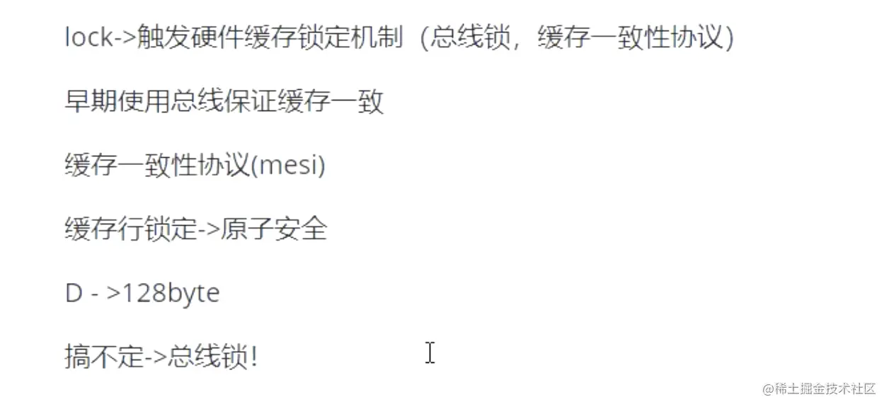 mesi协议:缓存一致性协议是这么工作的,在我们硬件里面约定好了一种协议,cpu在启动之后会采用一个监听模式一直会去监听总线里面消息的传递,也就是说有任何人从总线里面拿了些什么东西,只要你被lock前缀修饰了cpu都能感知得到