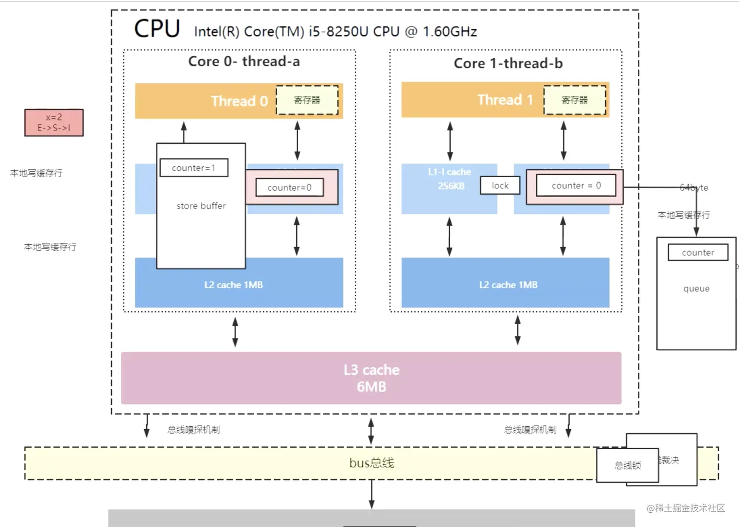 那么这个x变量通过总线的时候就会被CPU B给监听到,当读过去之后CPU A就会产生一个x变量的副本,并给x变量的副本标记为e(独占)