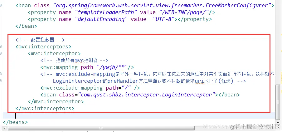 <bean class="com.qust.shbz.interceptor.LoginInterceptor"></bean>