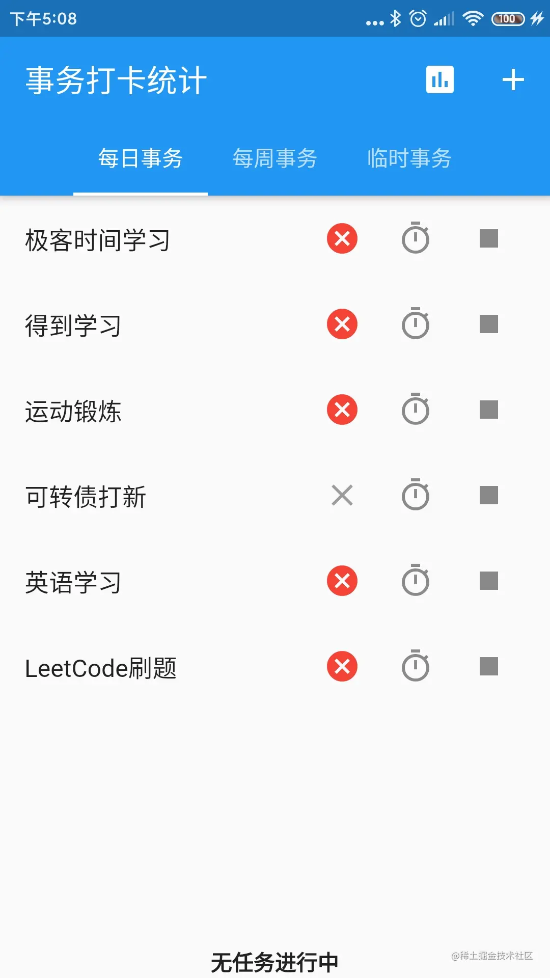 展示任务列表,右上角分别是统计详情按钮和任务添加按钮;任务三个按钮分别是打开按钮(每日任务完成后点击后变完成按钮,任意切换),任务计时开始按钮,任务计时停止按钮