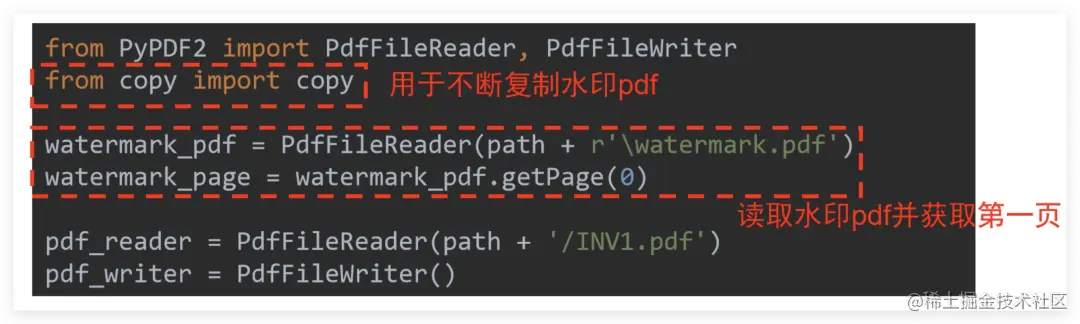 首先是准备工作,将需要作为水印的图片插入 word 中调整合适位置后保存为PDF文件。然后就可以码代码了,需要额外用到 copy 模块,具体解释见下图: