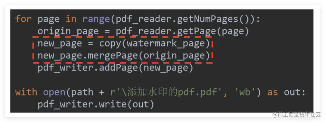 就是把读取器和写入器初始化,并且把水印 PDF 页先读取好备用,核心代码稍微比较难理解:
