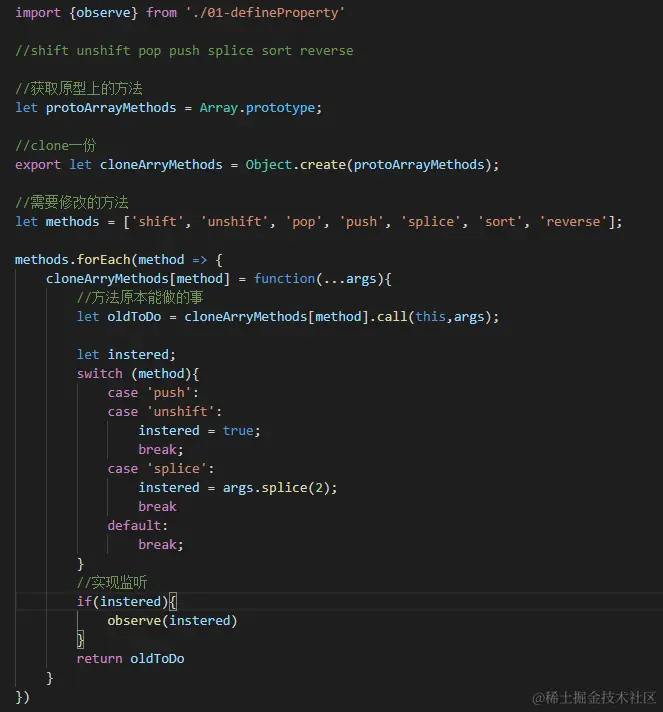 对于数组就那7个方法 vue的操作是对数组这些方法进行原型的重写,除了方法能做的事外还要做一个事就是实现数据劫持监听。对数组处理思路大致如下