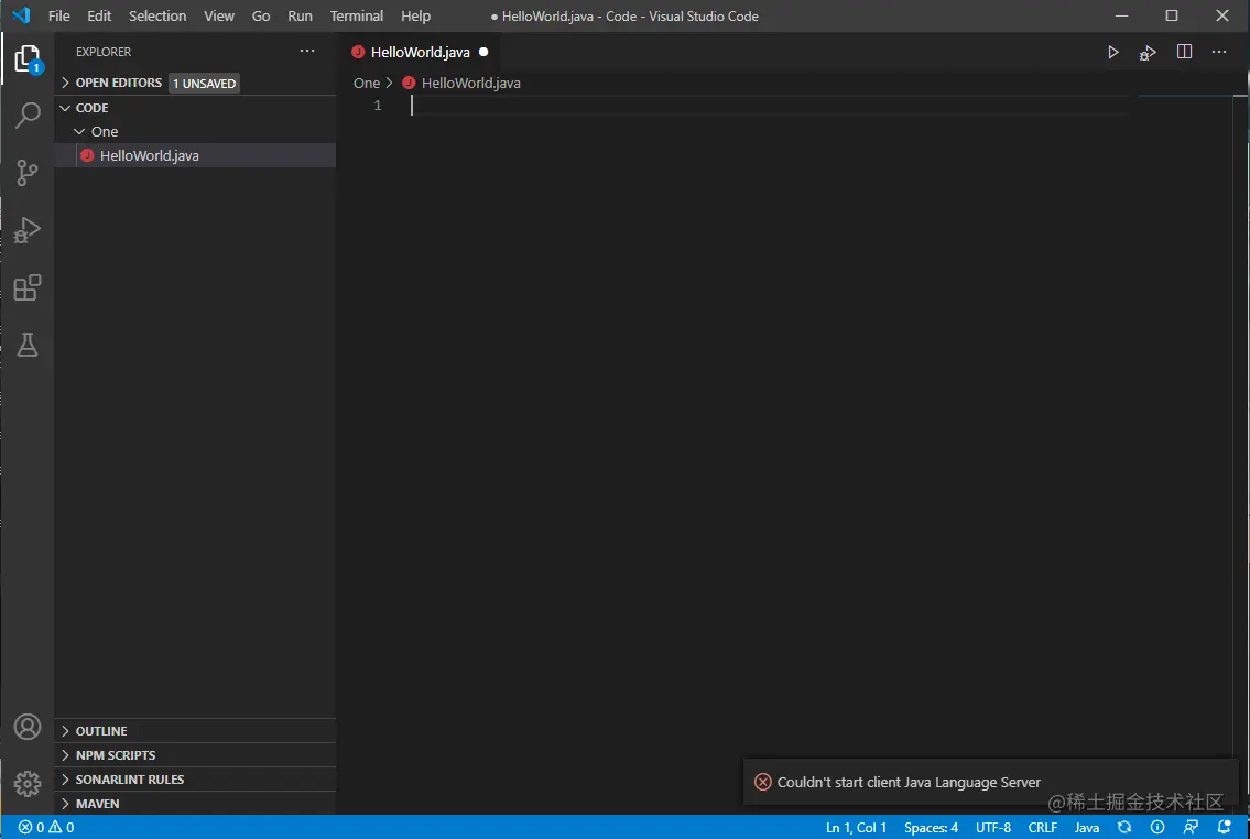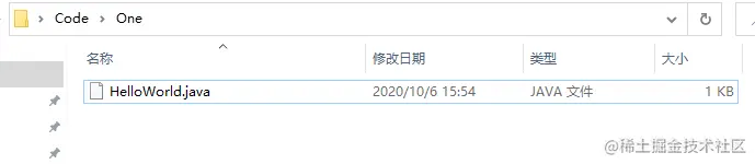 我们先创建一个文件夹来存放我们编写的程序,我在桌面上创建一个”Code“文件夹,然后在里面创建一个”One“文件夹用来当作文件目录。然后在该文件夹中创建一个"HelloWorld.java"文件。