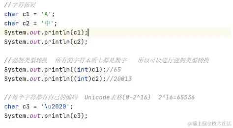 Java数据类型 九键按三下 2020-10-06 94 阅读1分钟 数据类型 基础数据类型 八大数据类型: 引用数据类型: 拓展 整数:进制转换表达问题 浮点数:注意 float类型变量的有限性,舍入误差等等引起的数值比较问题 最好完全避开用浮点数进行比较 字符:本质上是数字,可以进行强制类型转换 转义字符:需要去记一些常用的转义字符 输出结果: 布尔值: