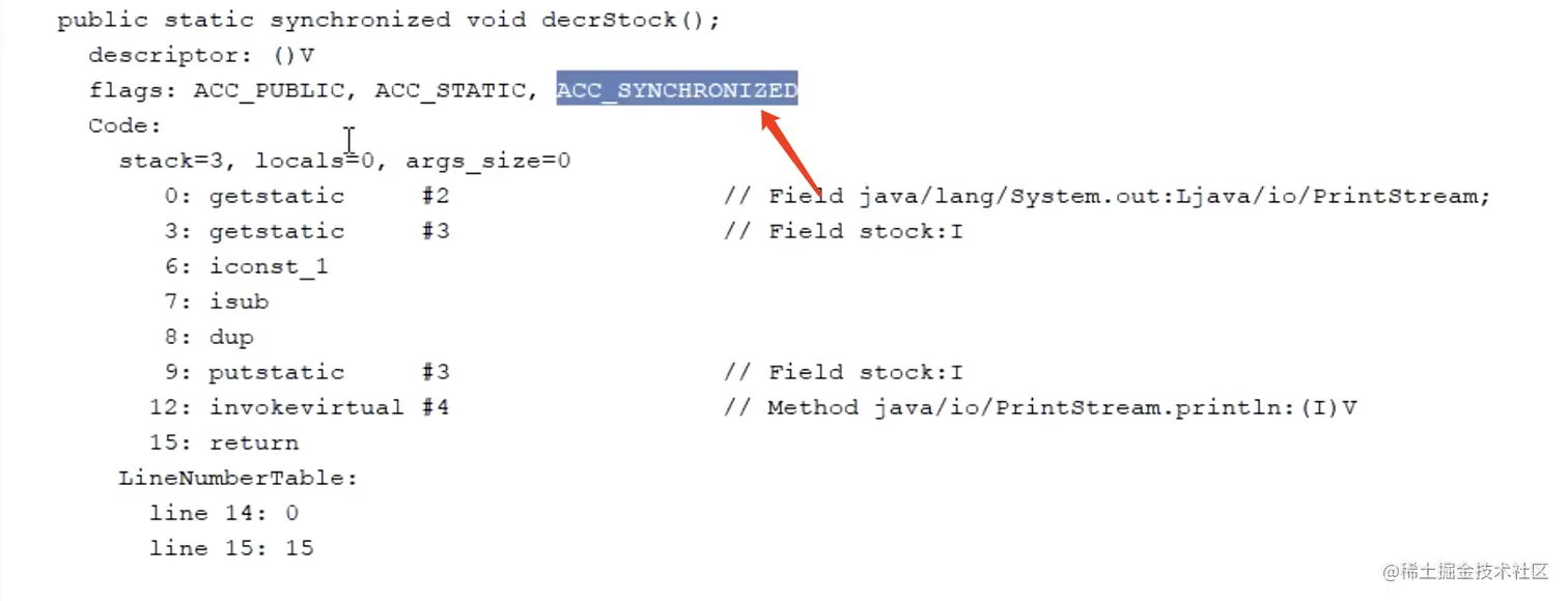 ACC_SYNCHRONIZED表示在执行下面方法的时候要加上内置锁,会自动触发加上monitorenter和monitorexit