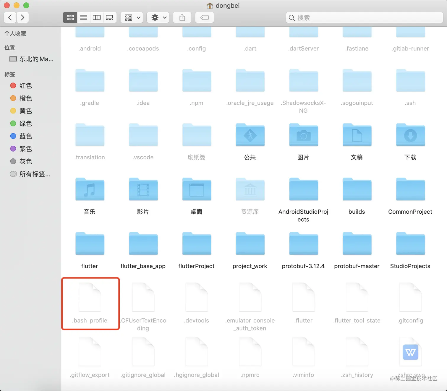 在当前文件夹下,如果设置显示隐藏文件可能会看到** .bash.profile** 文件,这个文件里配置环境变量相关。