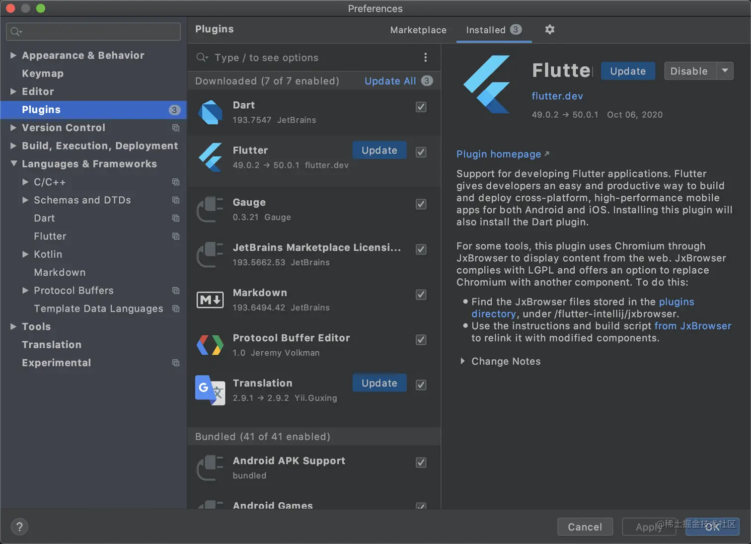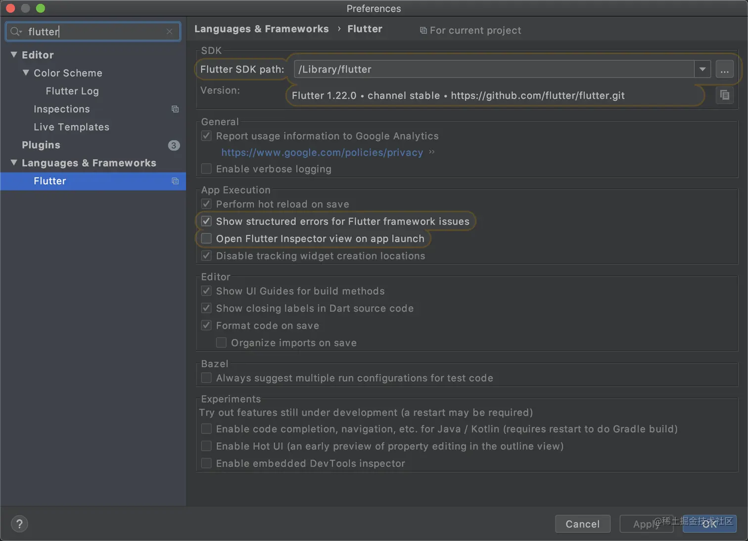 - 在搜索栏里输入flutter,点击Languages & Frameworks下的 flutter 选项,在Flutter SDK path里选择刚才放置的Flutter Sdk的路径的根目录即可。