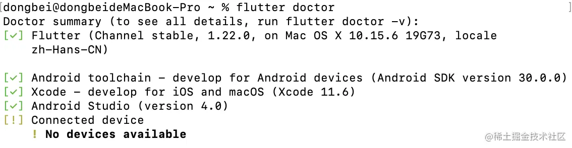 - 最后,输入 source ~/.bash_profile ,保存配置,再输入 **flutter doctor **, 查看配置是否生效,显示如下即为成功: