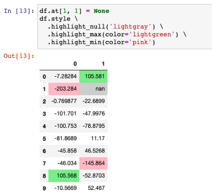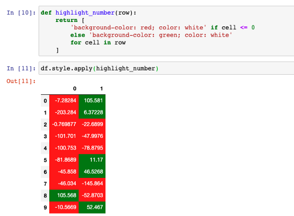 例如,对于上面显示的同一个 DataFrame,我们希望分别突出显示正数和自然数。如果你对CSS有一些基本的了解,或者只是简单的Google一下,你就会知道下面的属性来设置HTML表格单元格的背景颜色和文本颜色。