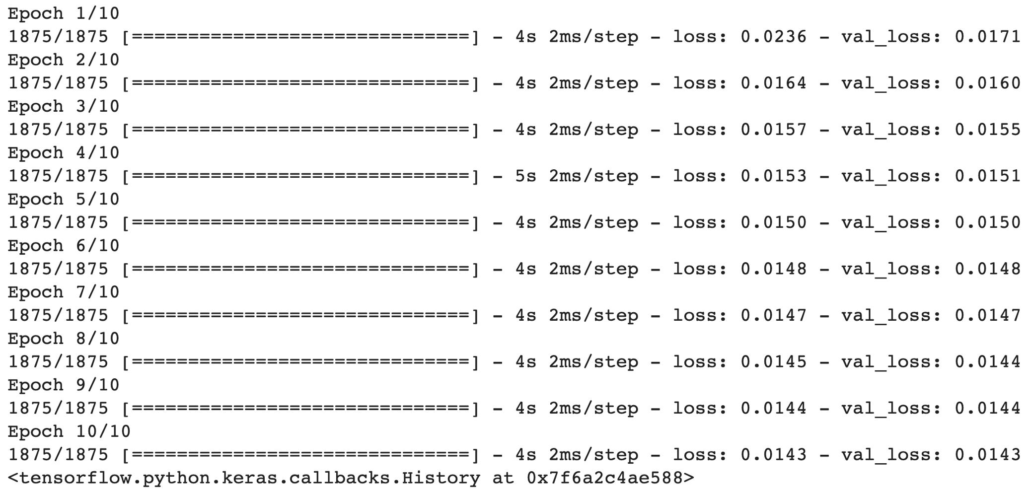 对于这个任务,我们将使用Adam优化器和模型的均方误差。我们可以很容易地使用compile函数来配置我们的自编码器,如下所示: