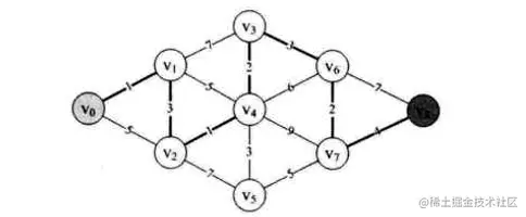 在无向图 G=(V,E) 中,假设每条边E[i]的长度为w[i],找到由顶点V0到其余各点的最短路径。