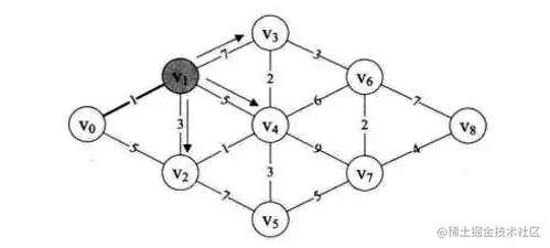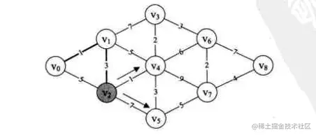 假设已经找到V0与V1的最短路径的基础上,对V1与其他顶点的边进行计算,得到V0与它们的当前最短距离,因为min=1,所以本来V0->V2=shortPath[2]=5, 现在V0->V1->V2=shortPath[2]=min+3=4, V0->V1->V3=shortPath[3]=min+7=8, V0->V1->v4=shortPath[4]=min+5=6,因此,shortPath数组当前值为{0,1,4,8,6,65535,65535,65535,65535}。而pathSrc[2]=1 ,pathSrc[3]=1,pathSrc[4]=1, 它表示的意思是V0到V2、V3、V4 点的最短路径的前驱均是V1。此时pathSrc数组值为: {0,0,1,1,1,0,0,0,0}。
