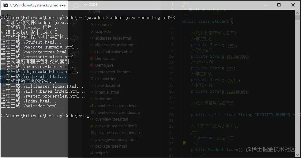如果我们写完的代码需要给别人使用或者查看,直接在代码中编写文档注释然后使用javadoc Student.java -encoding utf-8 命令就可以直接生成一个文档给他看了。