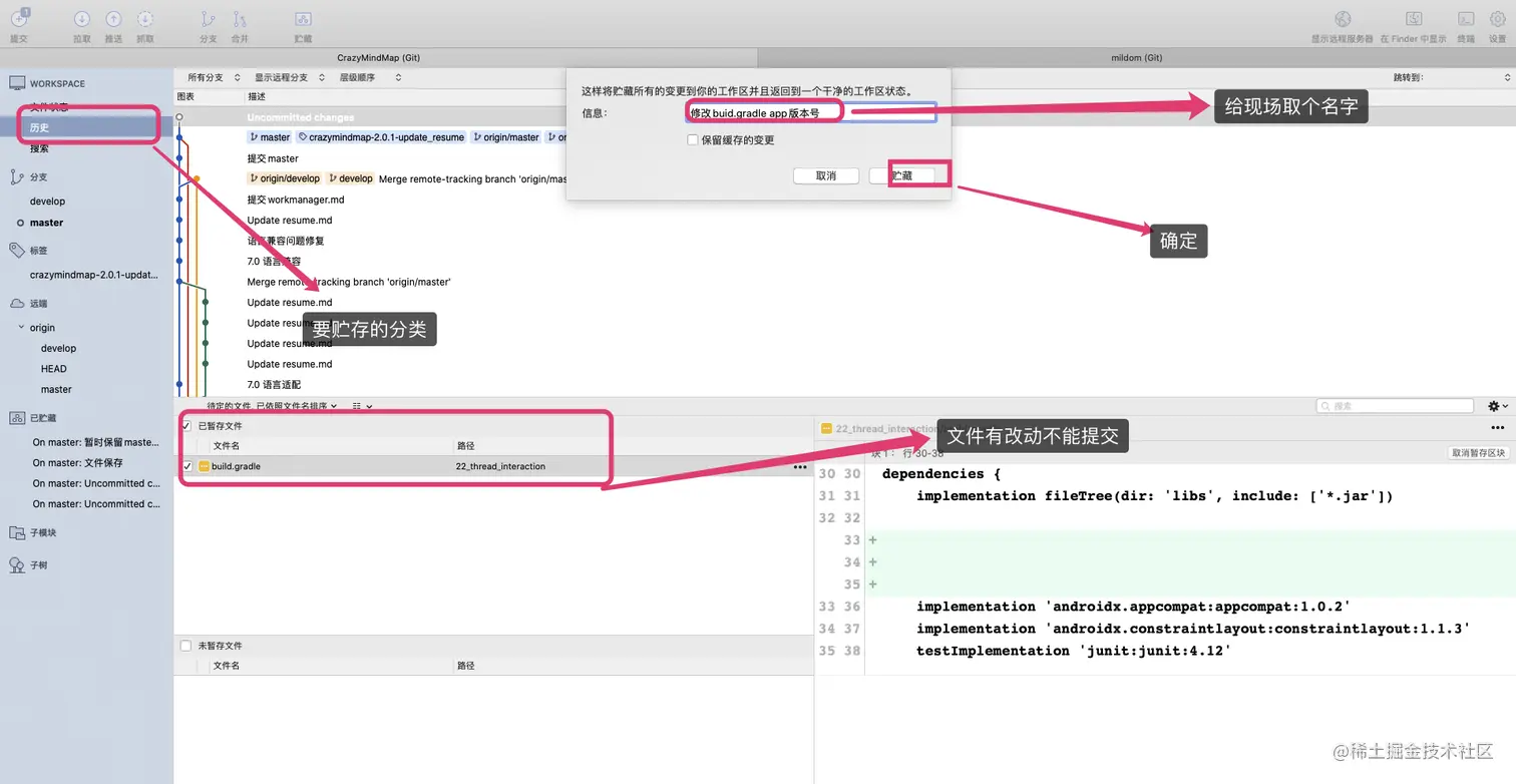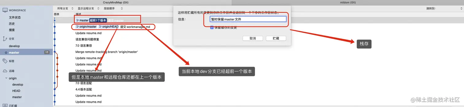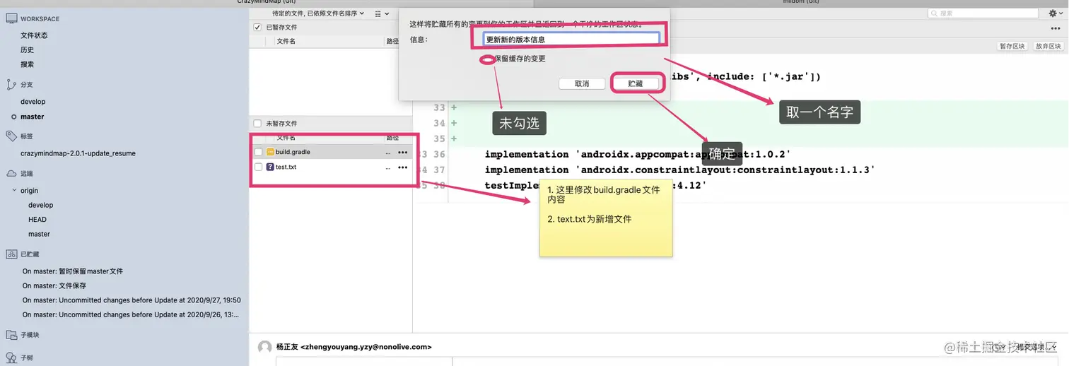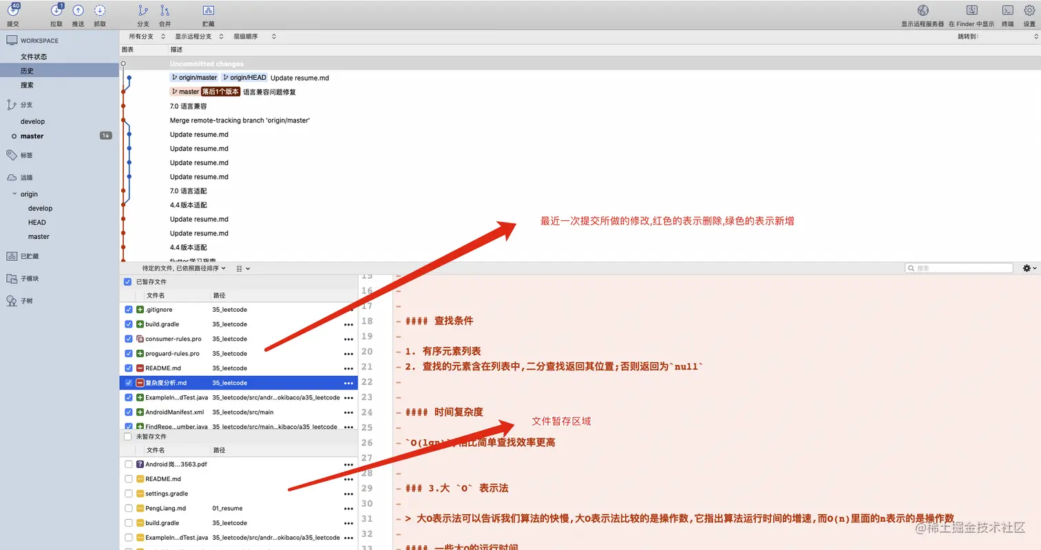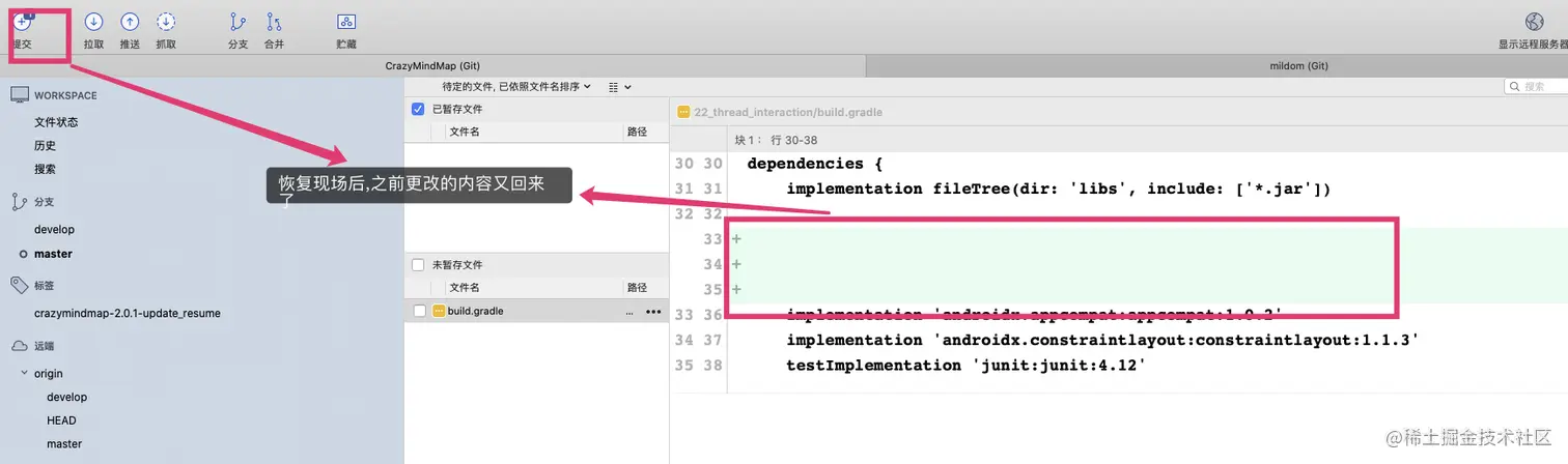 - 贮藏现场时,如果勾选了 保留暂存的更改 选项,那么已经加入暂存区的内容都会被保留