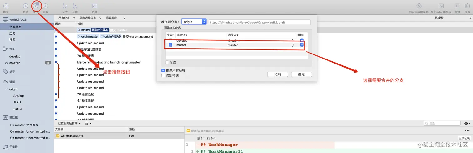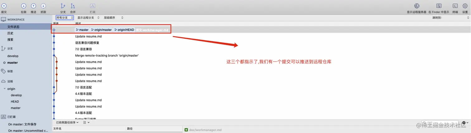 合并完成后,我们可以检查master分支下的文件,它已经与Dev分支下的修改一样了。然后将master分支推送到服务端