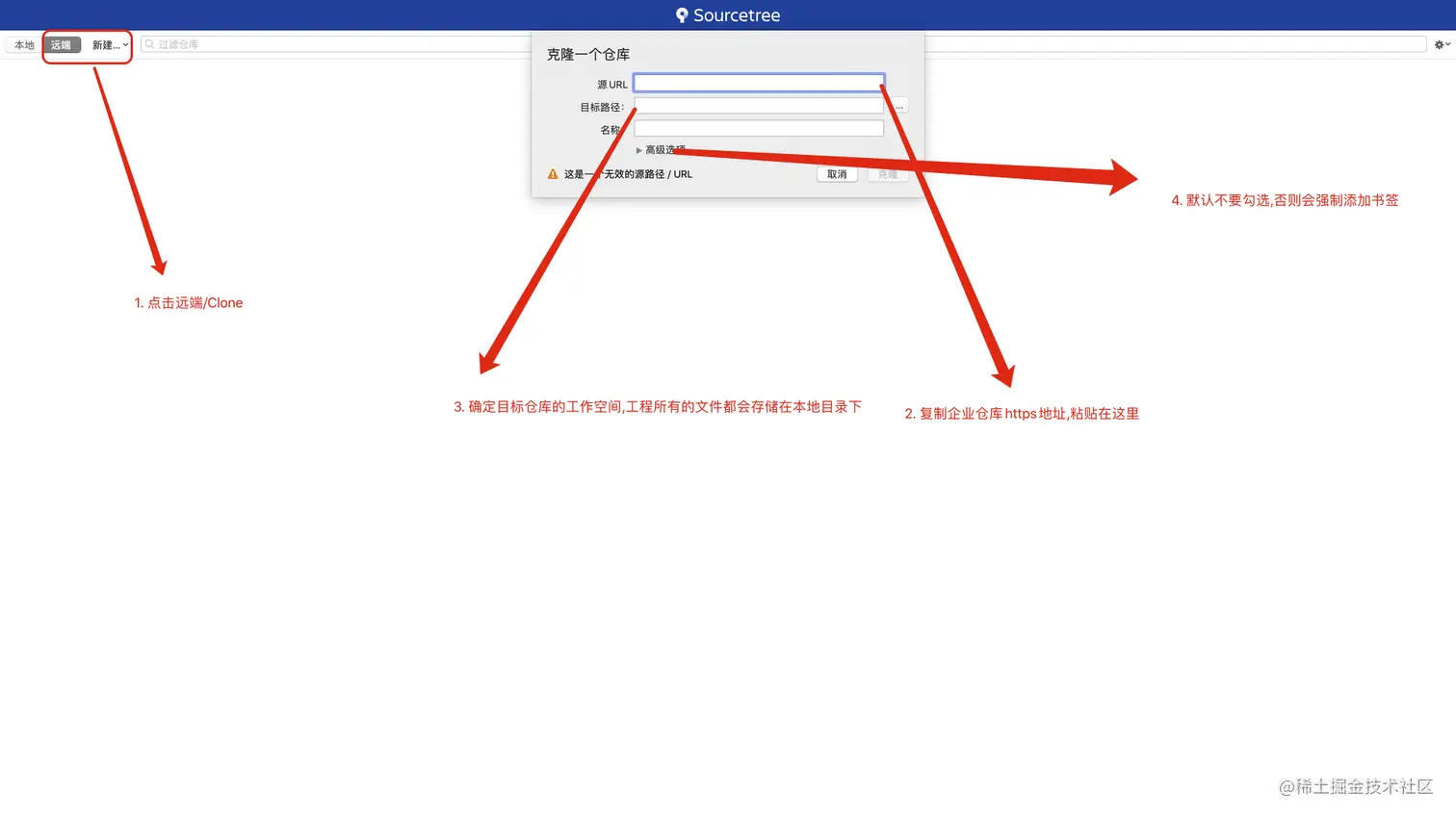 Git 和 SourceTree的安装就不用多说了,网上入门教程很多,我们直接从怎样克隆一个新项目到本地开始说