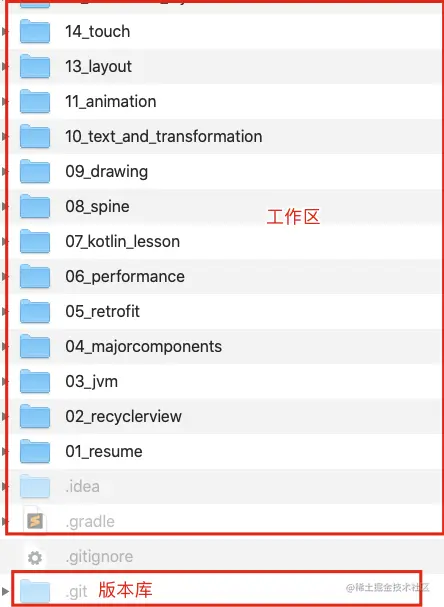 - 工作区中有一个.Git的目录,通常这是一个隐藏目录。前面已经说过这个文件夹,表示它所在的目录是Git管理的仓库。这个文件夹下,存放就是Git的版本库信息,这就是Git的版本库