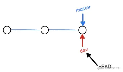 - 当创建新分支dev时,实际上是新创建了一个dev指针,但是,dev是从master分出去的,所有,初始时,dev和master在同一个节点