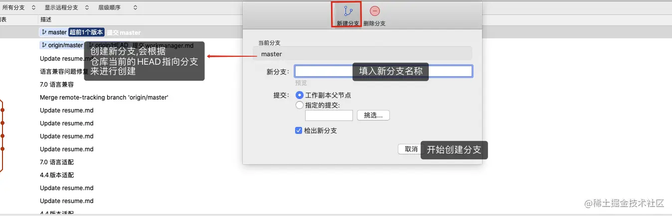- 创建新分支后,SourceTree(Git)会默认把HEAD指向新创建的分支,并且新分支与原来的分支所处的状态一样