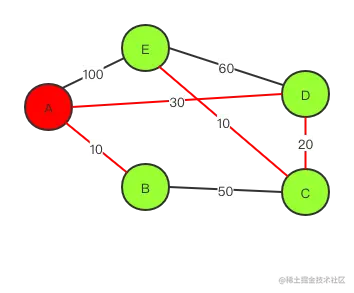 上图中,确定A到D的最短路径之后,对DC,DE边进行松弛操作,更新A到C,A到E的最短距离.
