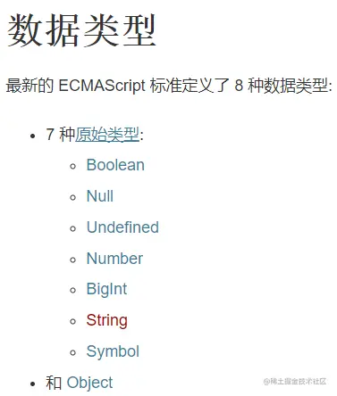 numberNaN/Infinity特殊string单引号/双引号/反引号``booleantrue/falsenullundefinedsymbol创建唯一值bigint