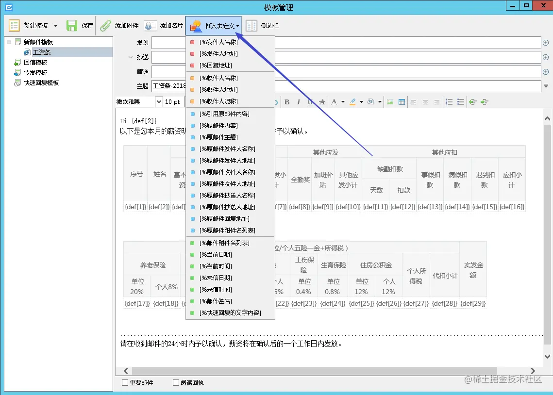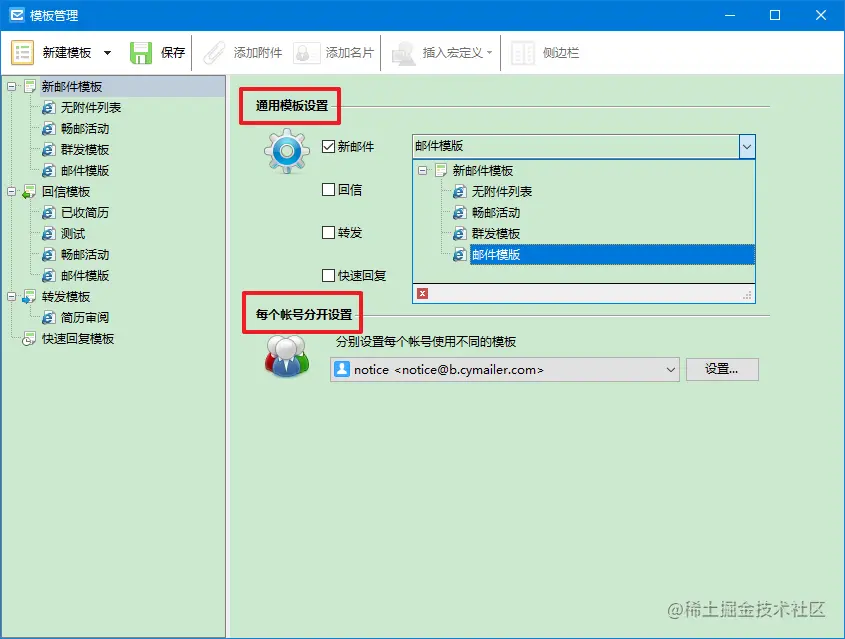 通用模板:写新邮件,默认打开该模板,不建议使用 帐号模板:针对每个帐号单独设置模板; 宏调用:可以使每个邮件都是独一无二的。