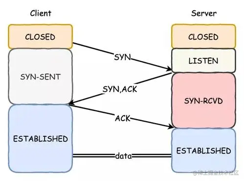 - 如果在SYN-SENT状态收到了服务端的确认包,它将发送确认服务端SYN报文的ACK包,同时进入ESTABLISHED状态,表明自己已经准备好发送数据。 对于服务端而言:
