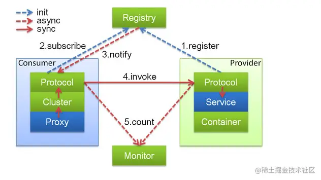 - protocol 远程调用层:封装 RPC 调用,以 Invocation, Result 为中心,扩展接口为 Protocol, Invoker, Exporter