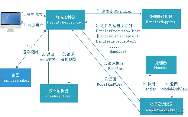 用户请求到达前端控制器,它就相当于mvc模式中的c,dispatcherServlet是整个流程控制的中心,