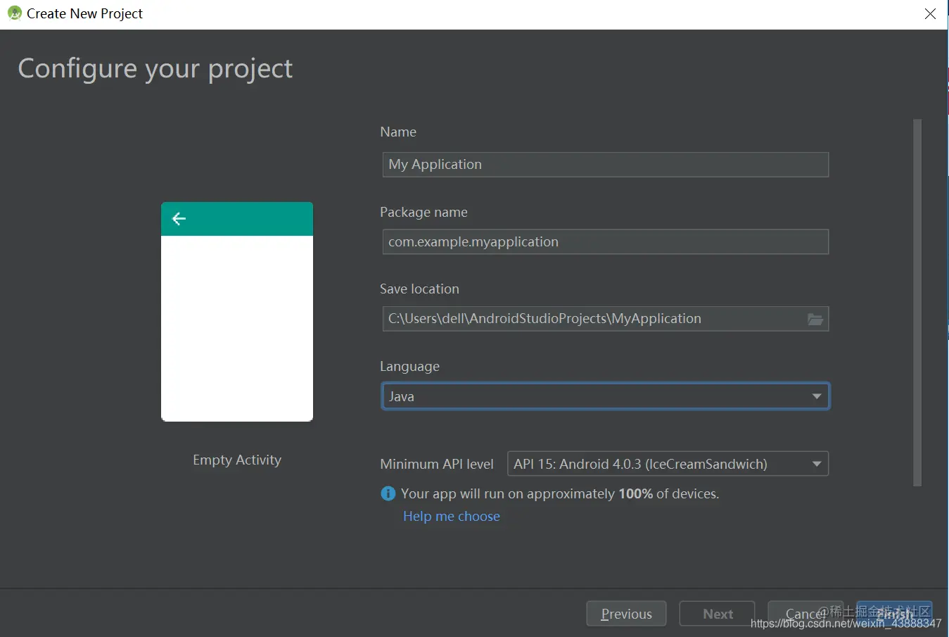 Name 项目名;Package name 包名;Save lcation 储存路径;Language 语言;填写完毕或默认 之后 Finish