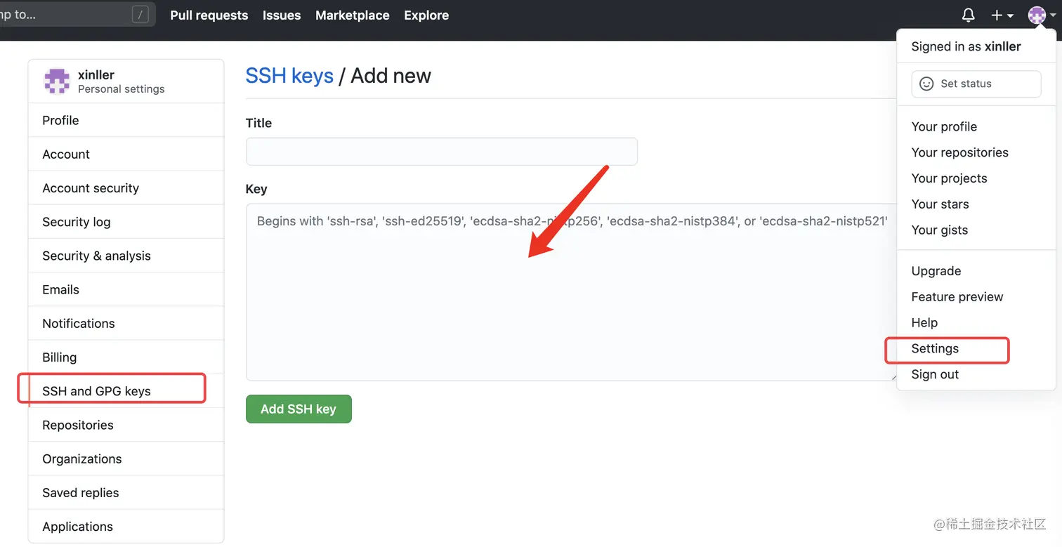 把id_ras.pub里头的key复制在github/settings/key中填入如下: title随便写