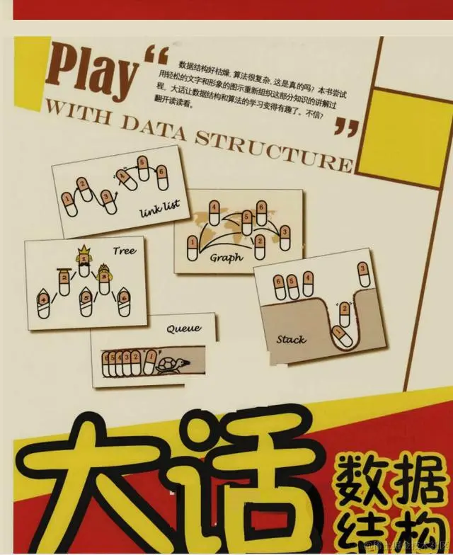 《大话数据结构》 这本书最大的特点是,它把理论讲得很有趣,不枯燥。而且每个数据结构和算法,作者都结合生活中的例子进行了讲解, 能让你有非常直观的感受。